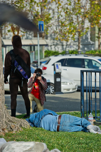 I assume the photographer in the picture above is including the man in his shot, I assume a homeless man who isn't there in his Santa suit looking to go bar hopping the afternoon long, as he's holding his camera horizontally rather than vertically. My own image would be a more interesting picture to me if he were shooting vertically and consciously or unconsciously ignoring the man on the ground.