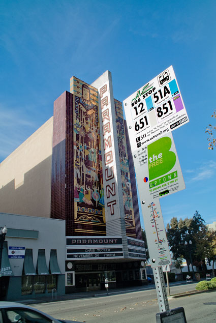 Hopped on one of the free buses down to Jack London Square after photographing the City Center tree now that they've finished the decorations. A traditional photograph of my reflection in one of the ornaments followed by another in Jack London Square. Pretty empty, Jack London Square, a shot or two of the yacht basin to see if I could get anything interesting out of the fog, half trying, I'm afraid, as I didn't feel like pushing very hard. An amble to Ben & Jerry's, but no tables out on their sidewalk, so a walk farther on to catch another bus, this time all the way to the Grand Lake theater area to find something to eat.