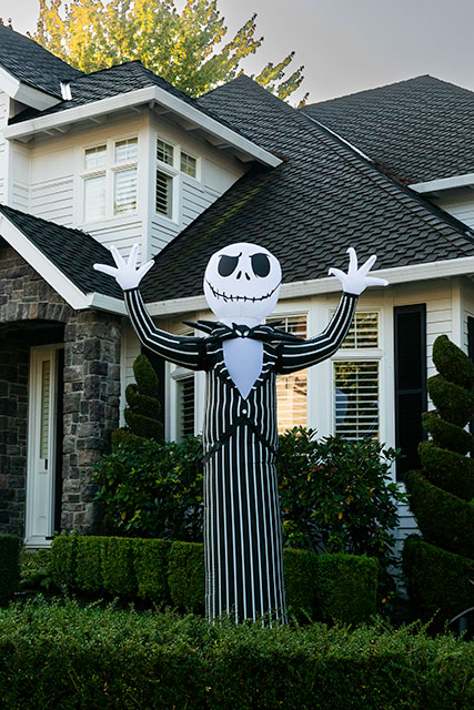 The morning walk at a quarter after nine, another new Halloween display in evidence and so a picture (could have used better processing) up top. Out the door and twenty-three minutes later home.