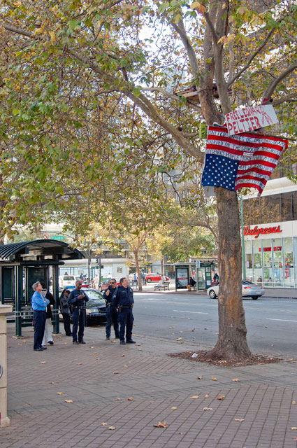 Later. A bus downtown in my bubble, dressed for the cold - a little nippy this morning - walking around the plaza area taking the usual set of pictures, the area for all practical purposes empty but for the security guards, perhaps a dozen; the fellow in the tree, still hiding from the camera; and a small group of ex-Occupiers sans tents on the sidewalk along the road.
